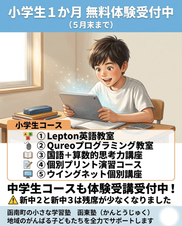 一人の講師がすべての学年・科目を教える小さな学習塾です。生徒たちが率先して通える雰囲気を大切にしています。函東塾を選んでくださった生徒さんに、居心地の良い環境で一生懸命に取り組んでもらえるように、温かなアットホームな雰囲気を大切にしています。個別プリントシステムや弱点補強用の映像教材(中学生は全単元受講し放題)、プログラミング講座、国語速読解講座など、近隣の大手塾に劣らない学習システム導入も行っています。